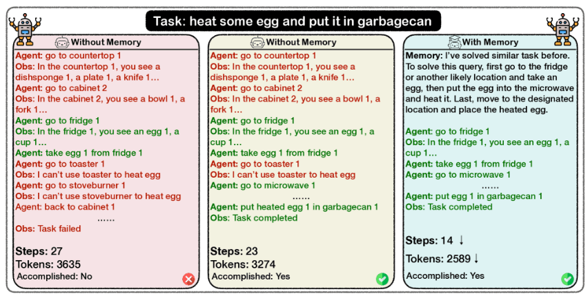 실험 결과, 멤프를 적용한 에이전트는 불필요한 시행착오를 줄이고 작업 성공률과 효율성이 크게 향상되었습니다. 단순히 목표에 도달하는 데 그치지 않고, 필요한 단계 수와 토큰 사용량도 줄어든 것이 특징입니다.