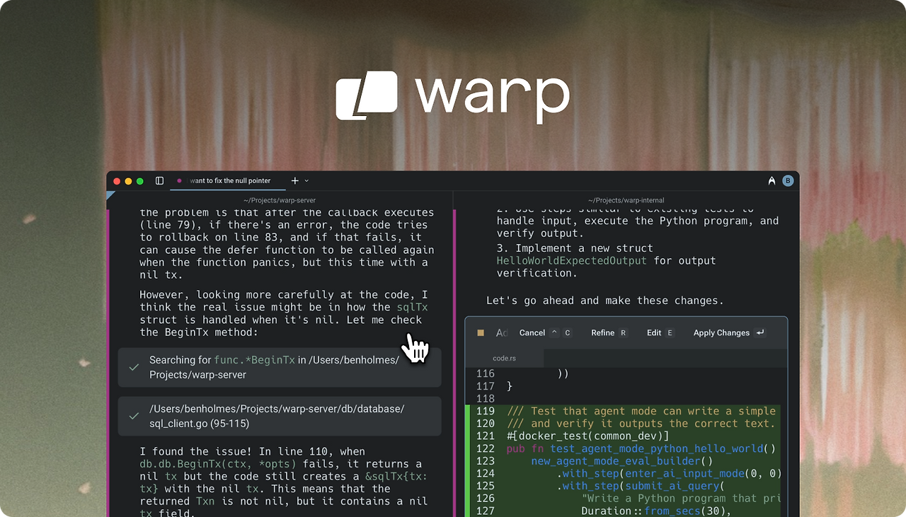 Warp Code는 에이전트 모드를 지원하여 코드베이스를 인덱싱하고, AI가 맥락을 이해하도록 합니다. 이를 통해 단순히 코드 조각을 생성하는 수준을 넘어 파일 간 참조와 맥락 기반 수정이 가능해집니다.