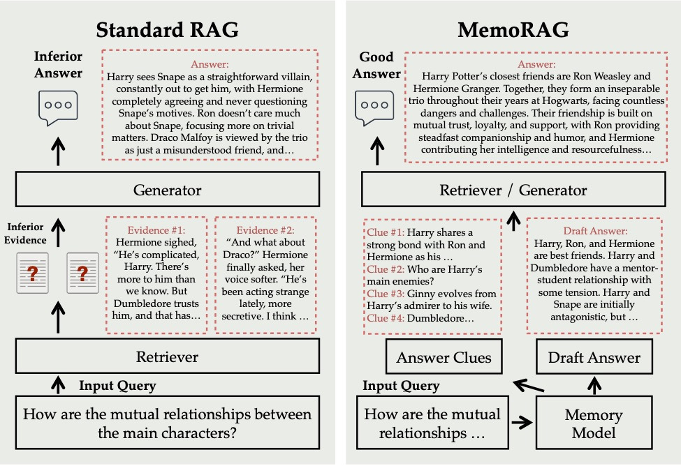 - MemoRAG: 데이터 전체를 전역 메모리(Global Memory)에 저장해 두고, 질문이 들어왔을 때 관련 단서를 회상(recall)하여 보다 풍부하고 정확한 답변을 생성