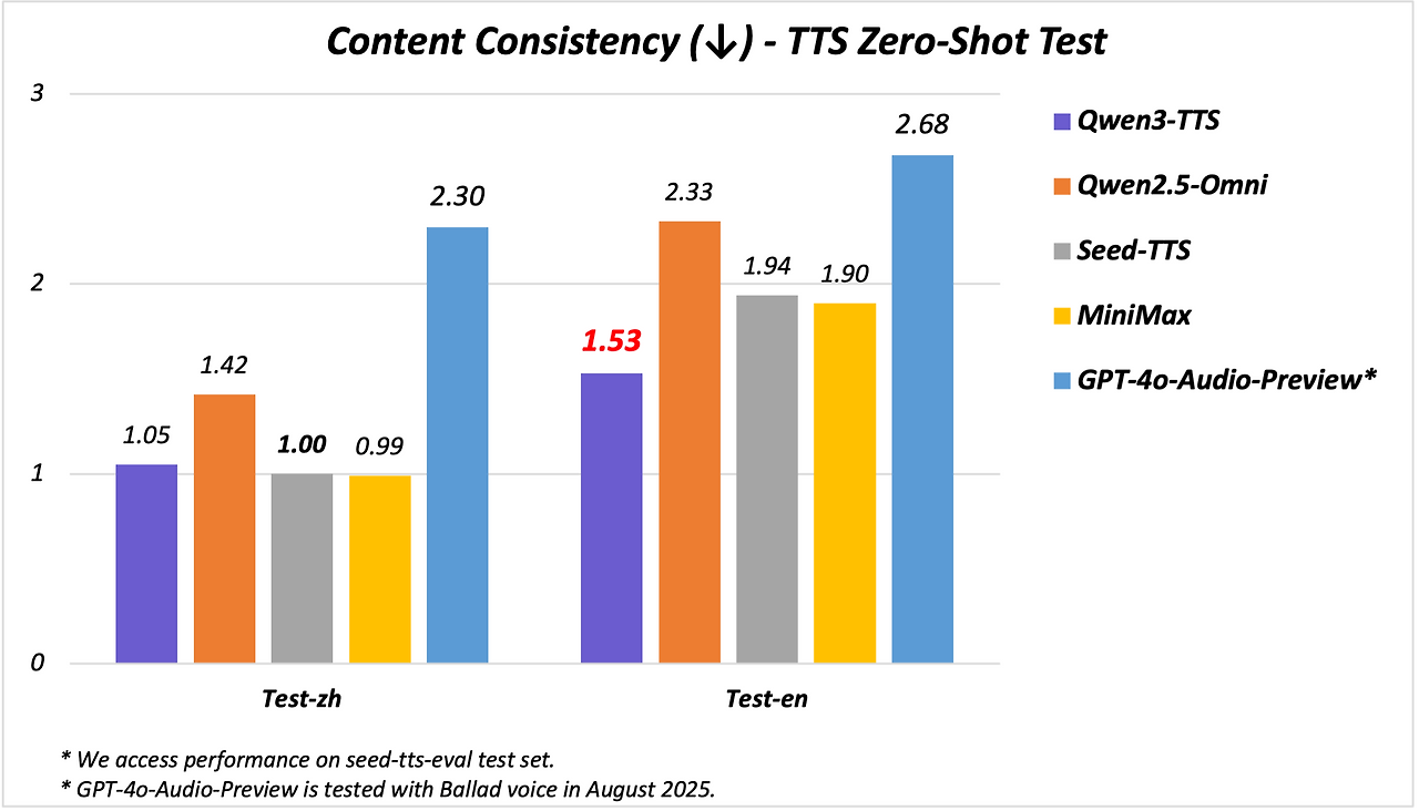 Qwen3-TTS-Flash는 중국어와 영어에서 업계 최고 수준(SOTA)의 안정성을 기록했습니다.