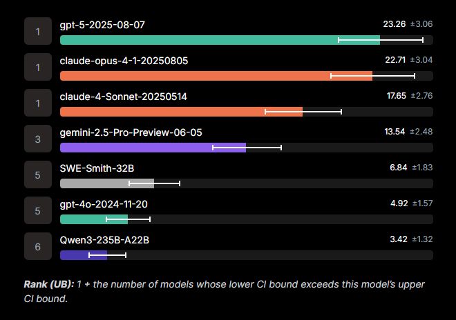 - GPT-5 성능: 23.3%로 가장 높은 점수를 기록