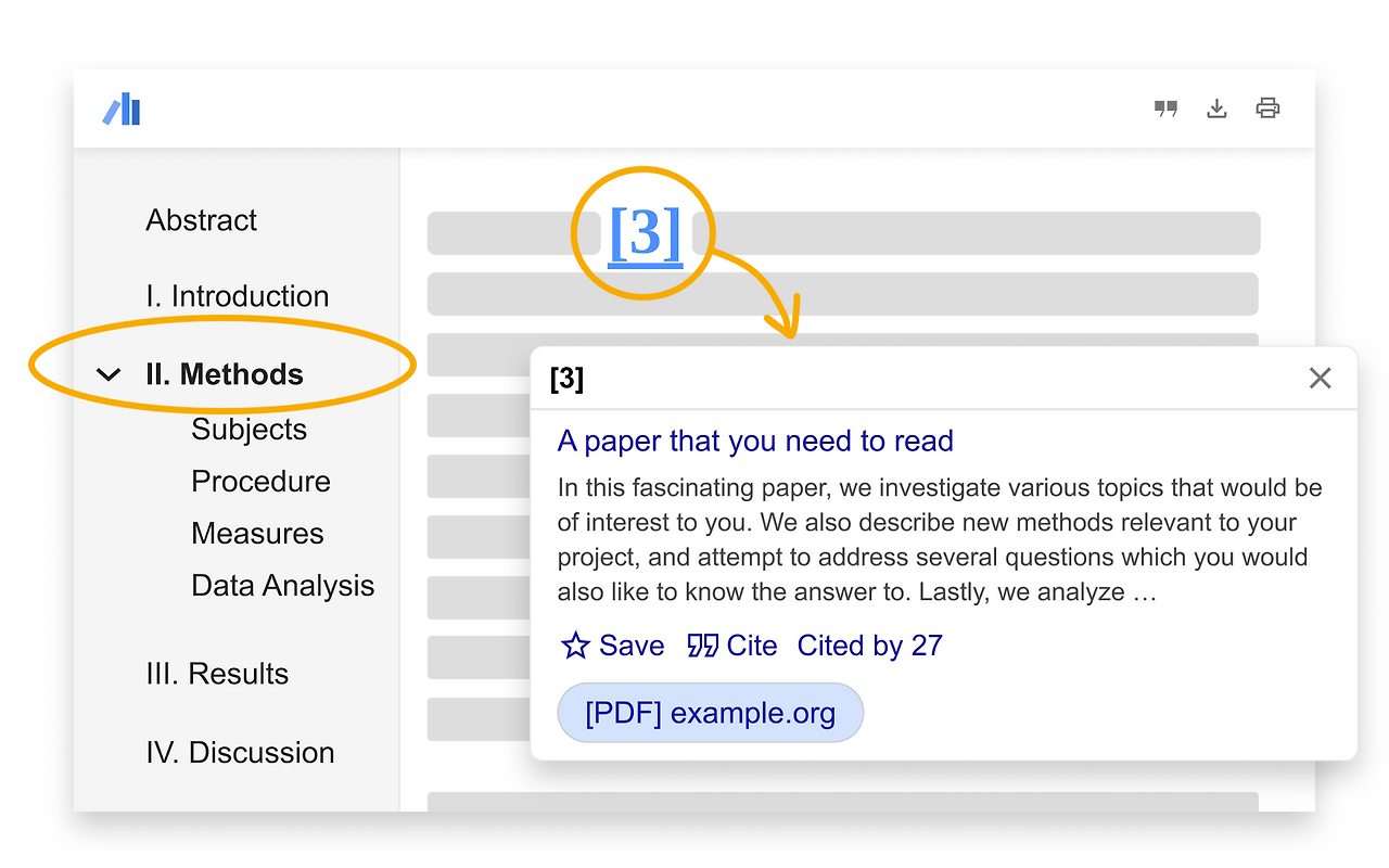 Google은 이러한 불편을 해소하기 위해 Google Scholar PDF Reader를 선보였습니다. 단순한 PDF 뷰어가 아니라, 논문 읽기를 빠르고 스마트하게 만들어주는 도구입니다. 논문 속 인용 문헌을 클릭 한 번으로 확인하고, 원하는 섹션이나 그림·표로 바로 이동할 수 있게 설계되었습니다.