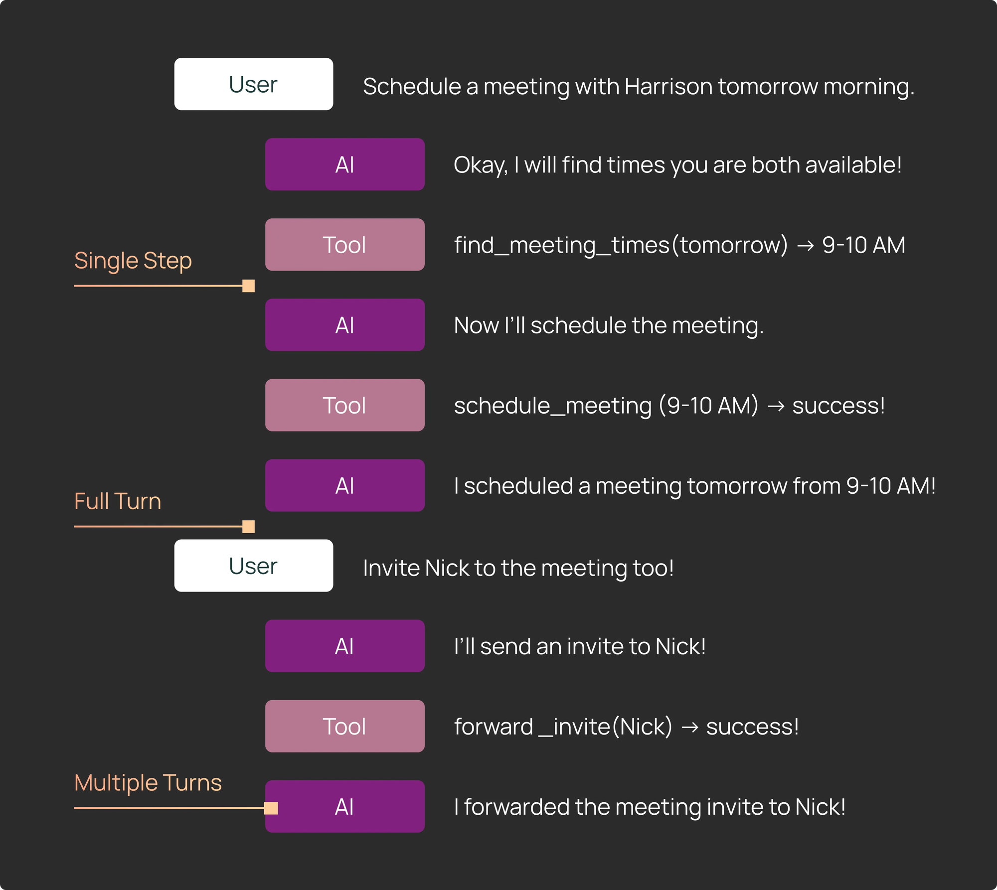 하나의 입력에 대해 에이전트를 끝까지 실행 (여러 도구 호출 포함 가능) - Multiple turns