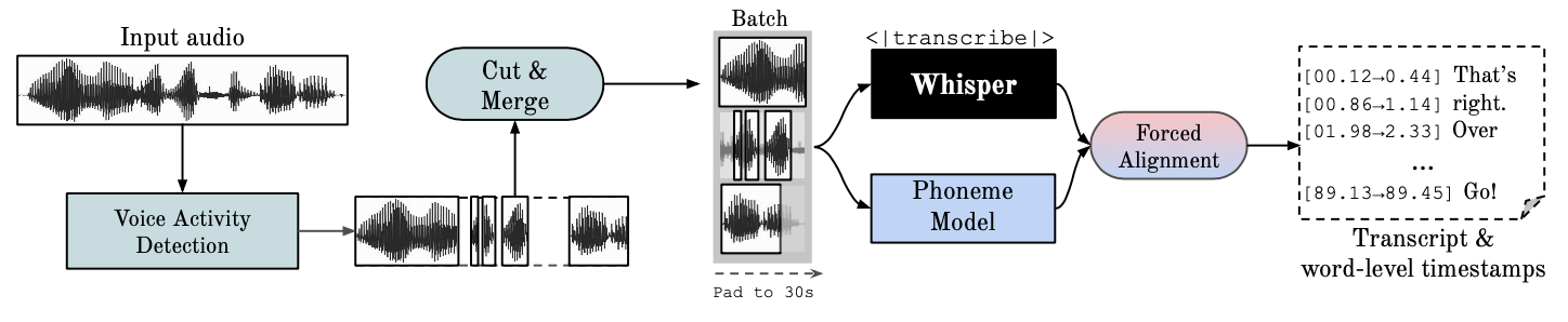 WhisperX는 이러한 문제를 해결하기 위해 여러 음성 처리 기술을 결합합니다.