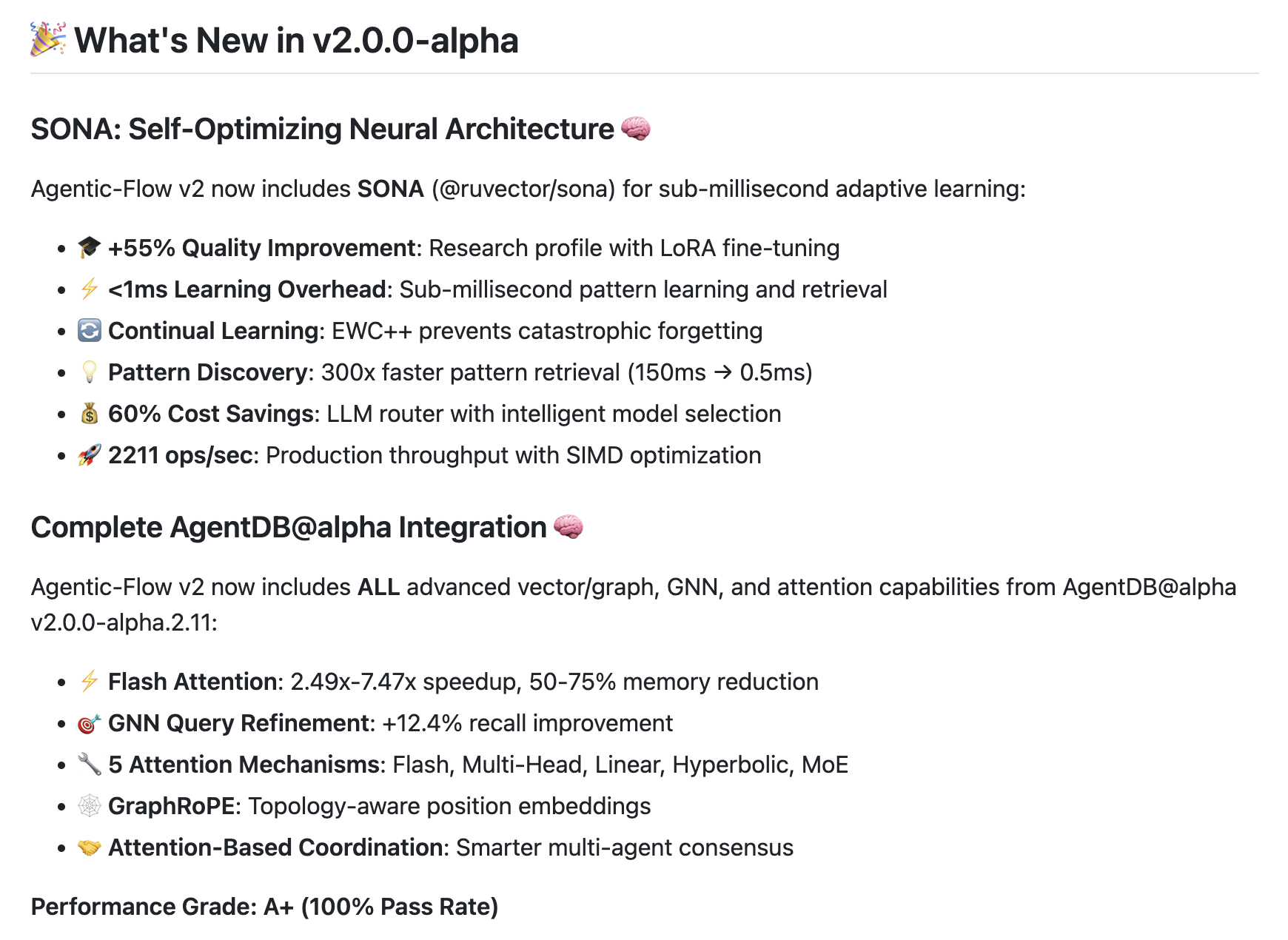 Agentic-Flow v2.0.0-alpha는 성능 지표에서도 명확한 방향성을 보여줍니다.