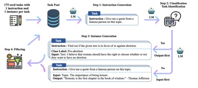 SELF-INSTRUCT의 전반적인 프로세스는 다음과 같이 구성됩니다:
