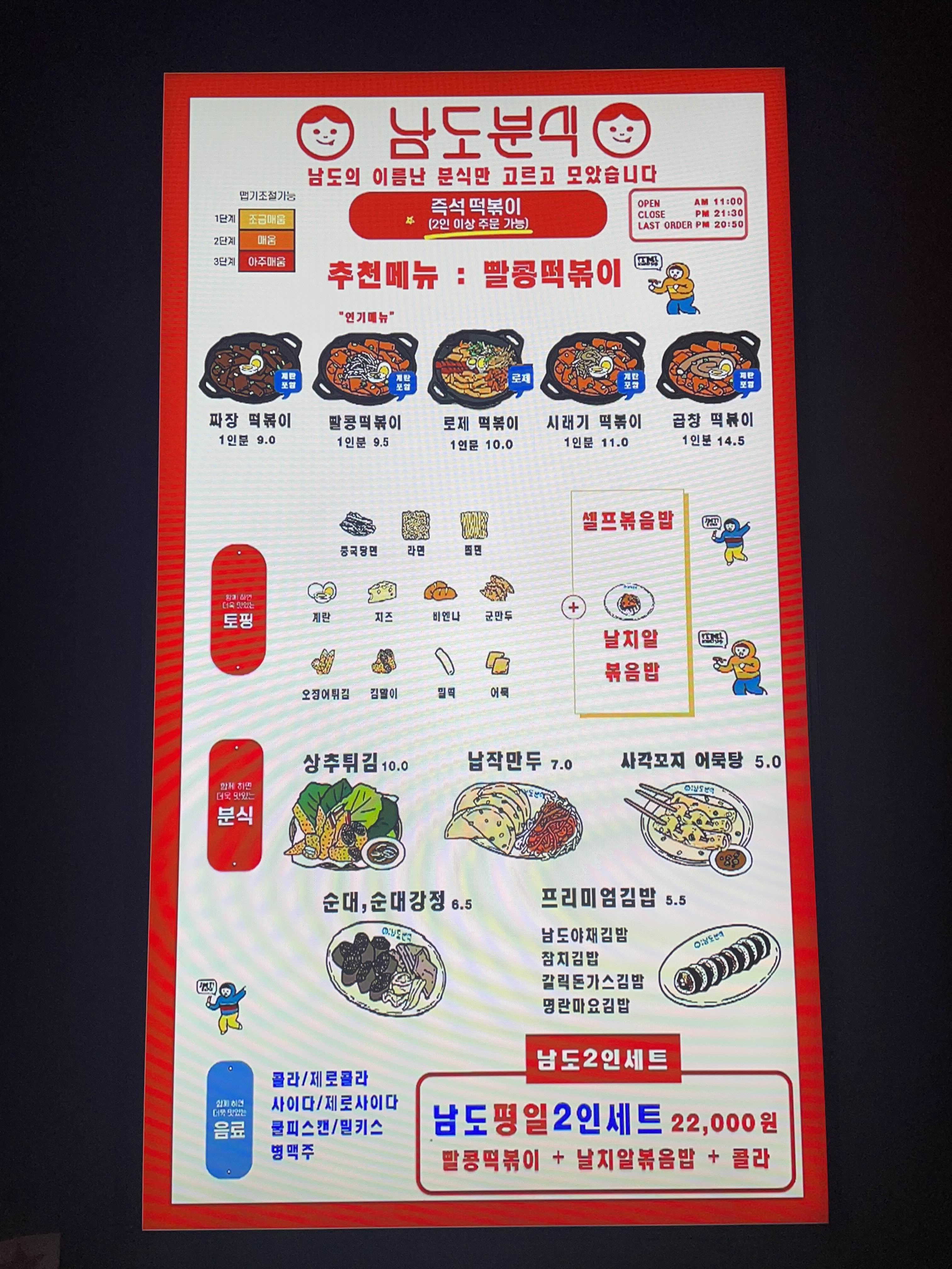 - 남도2인세트: 떡볶이 2인분 + 볶음밥 + 음료 22,000원