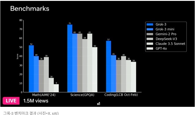 Grok 3는 각종 벤치마크 테스트에서 GPT-4o, Gemini 2.0 등 경쟁 모델을 뛰어넘었습니다.