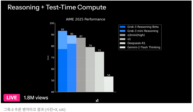 특히 고급 추론 기능이 강화된 Grok 3의 ‘Reasoning’ 버전은 AIME 테스트에서 무려 93점을 기록했습니다.