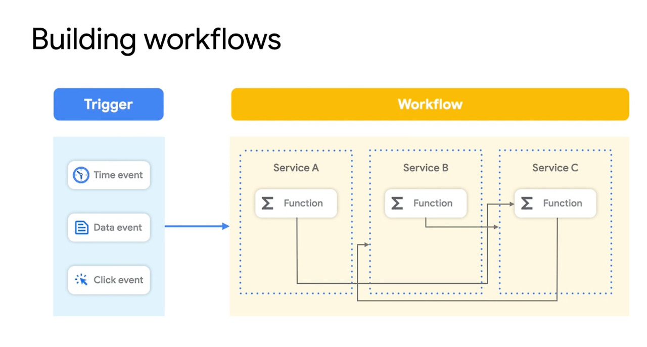 - Cloud Workflows는 백엔드 서비스·API 중심